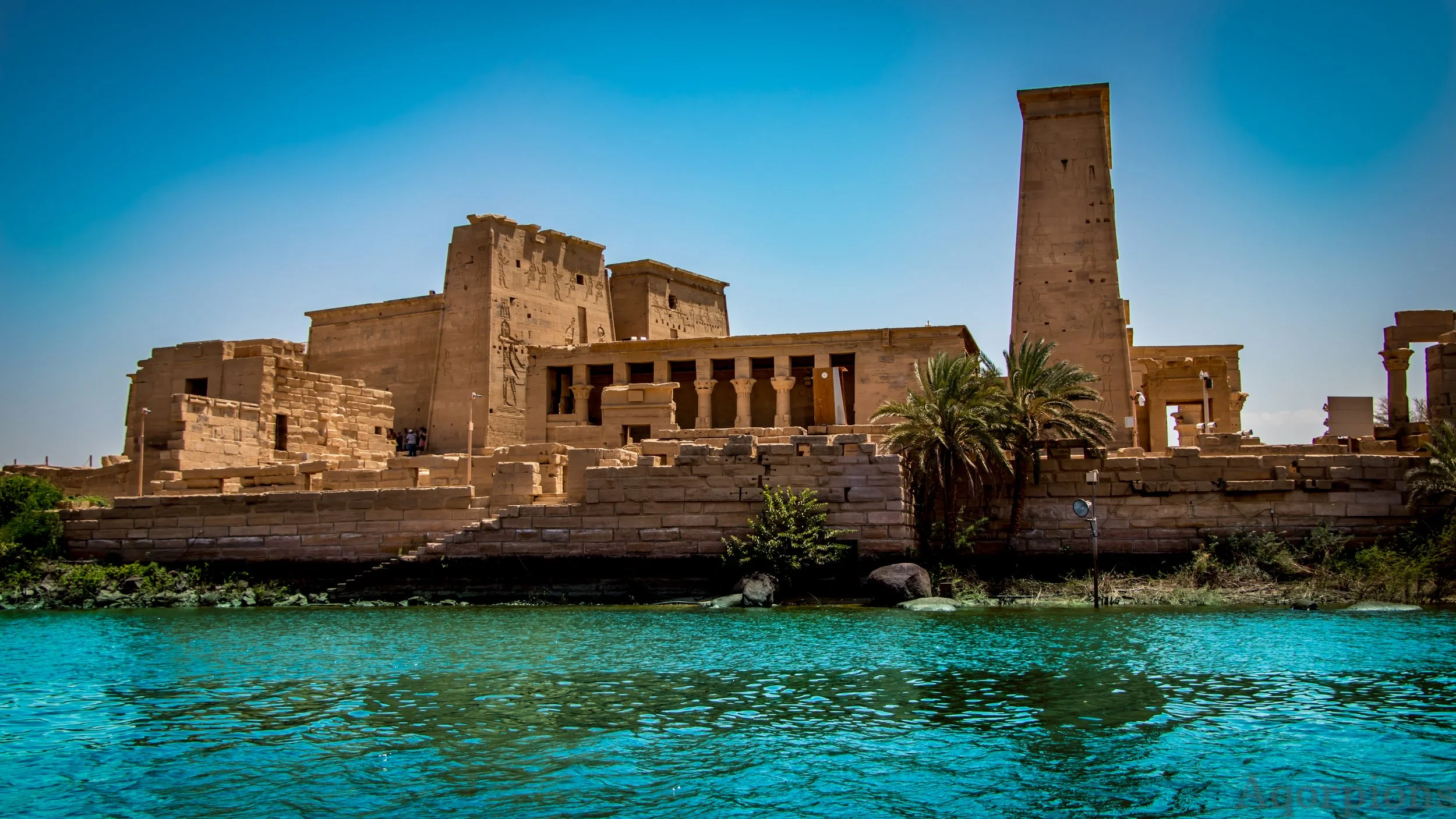 From the island, the Temple of Isis rests on the horizon - a powerful threshold for the journey ahead.